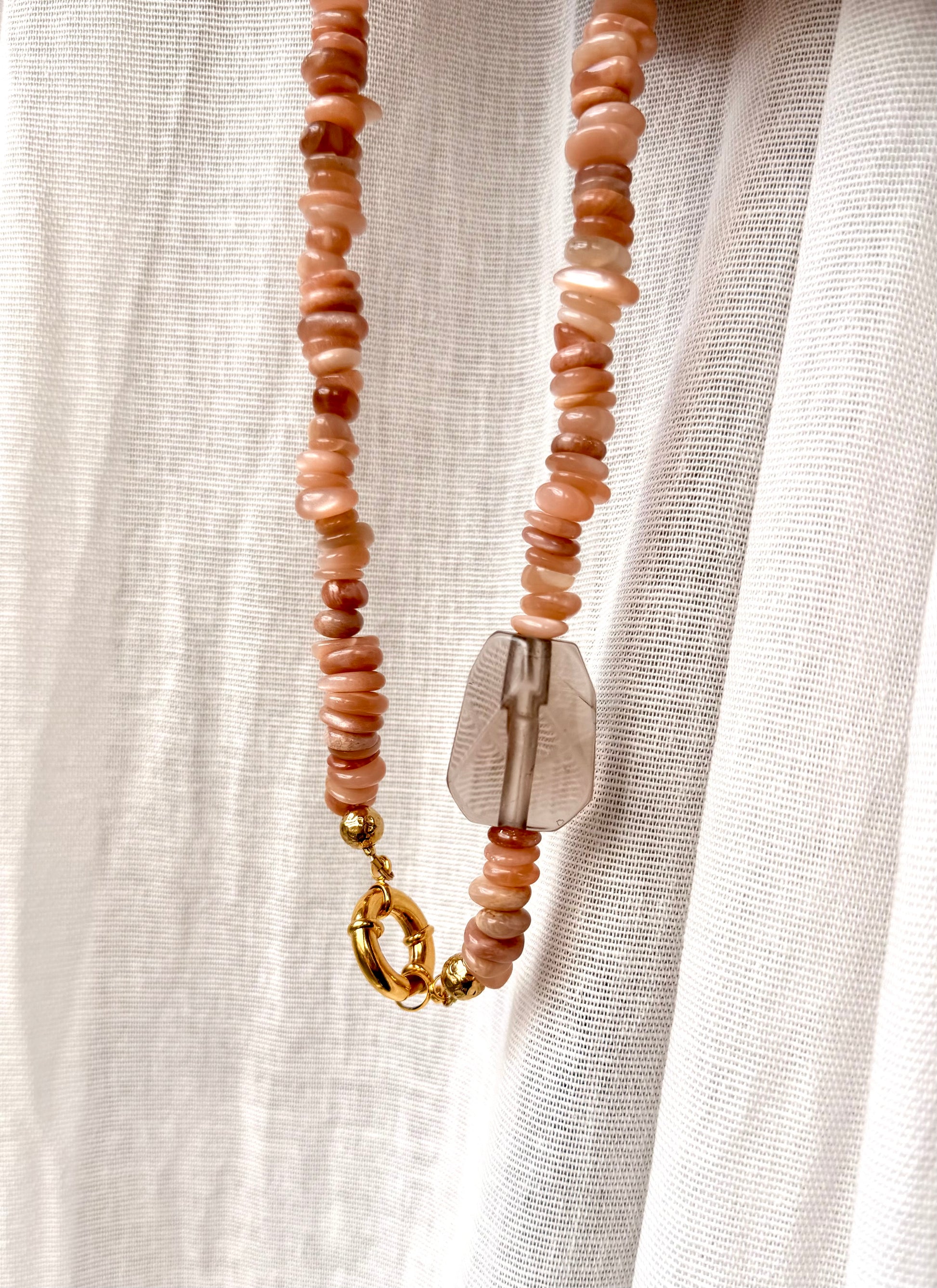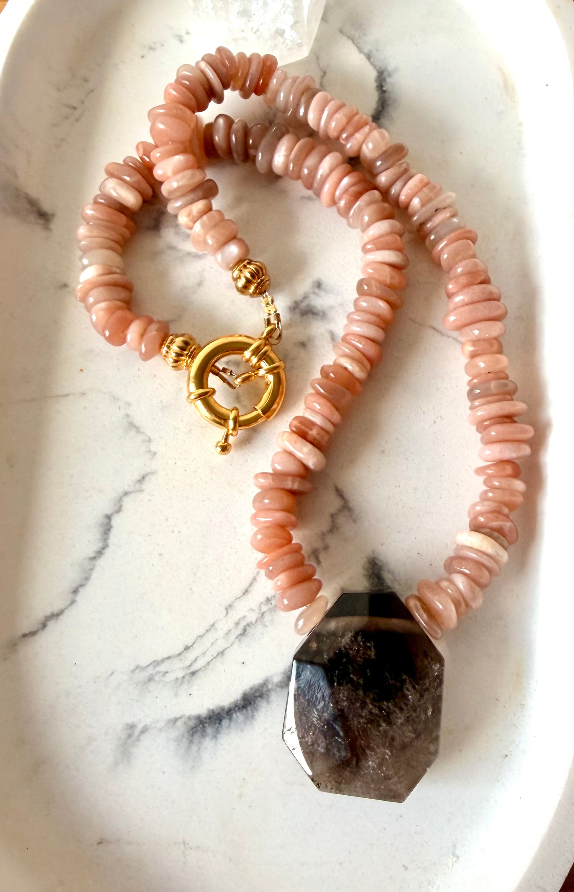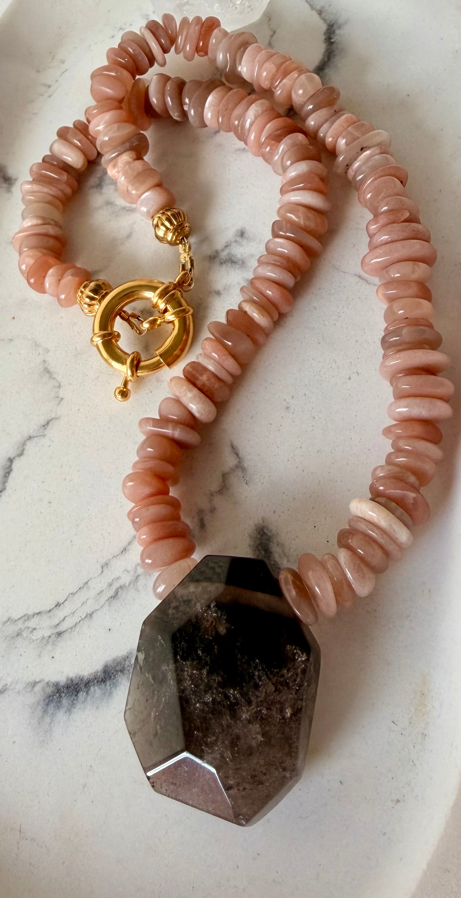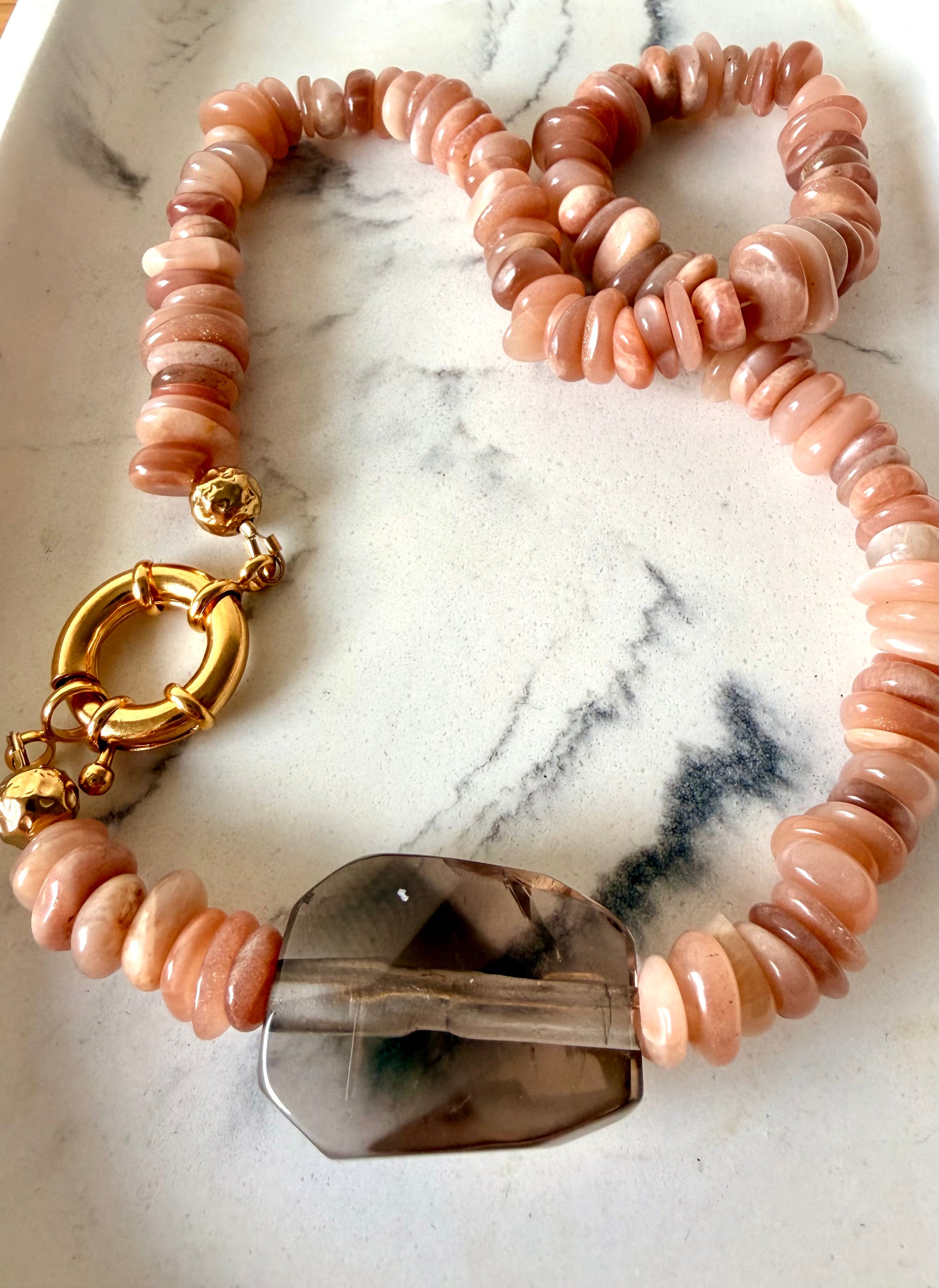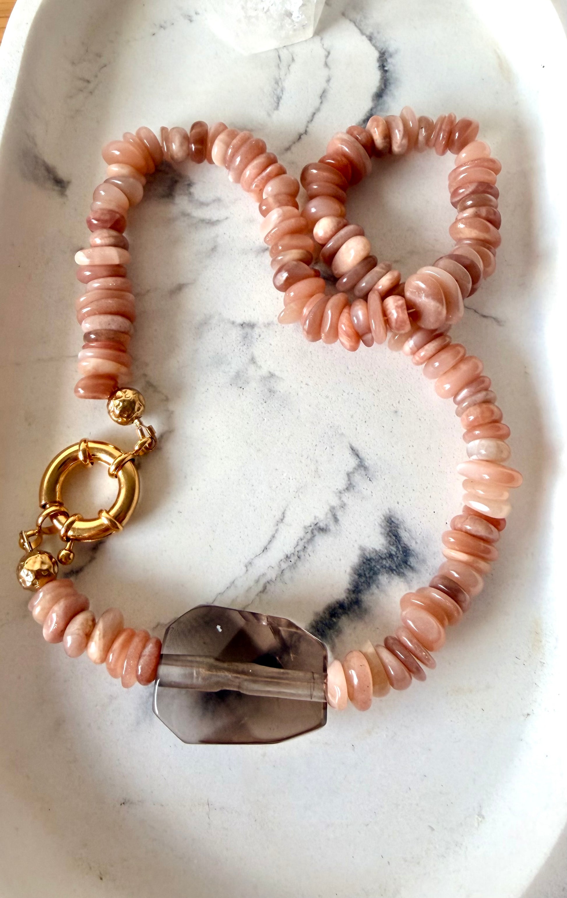 Handgefertigte Kette aus Mondstein-Scheibensteinen mit Rauchquarz Anhänger.