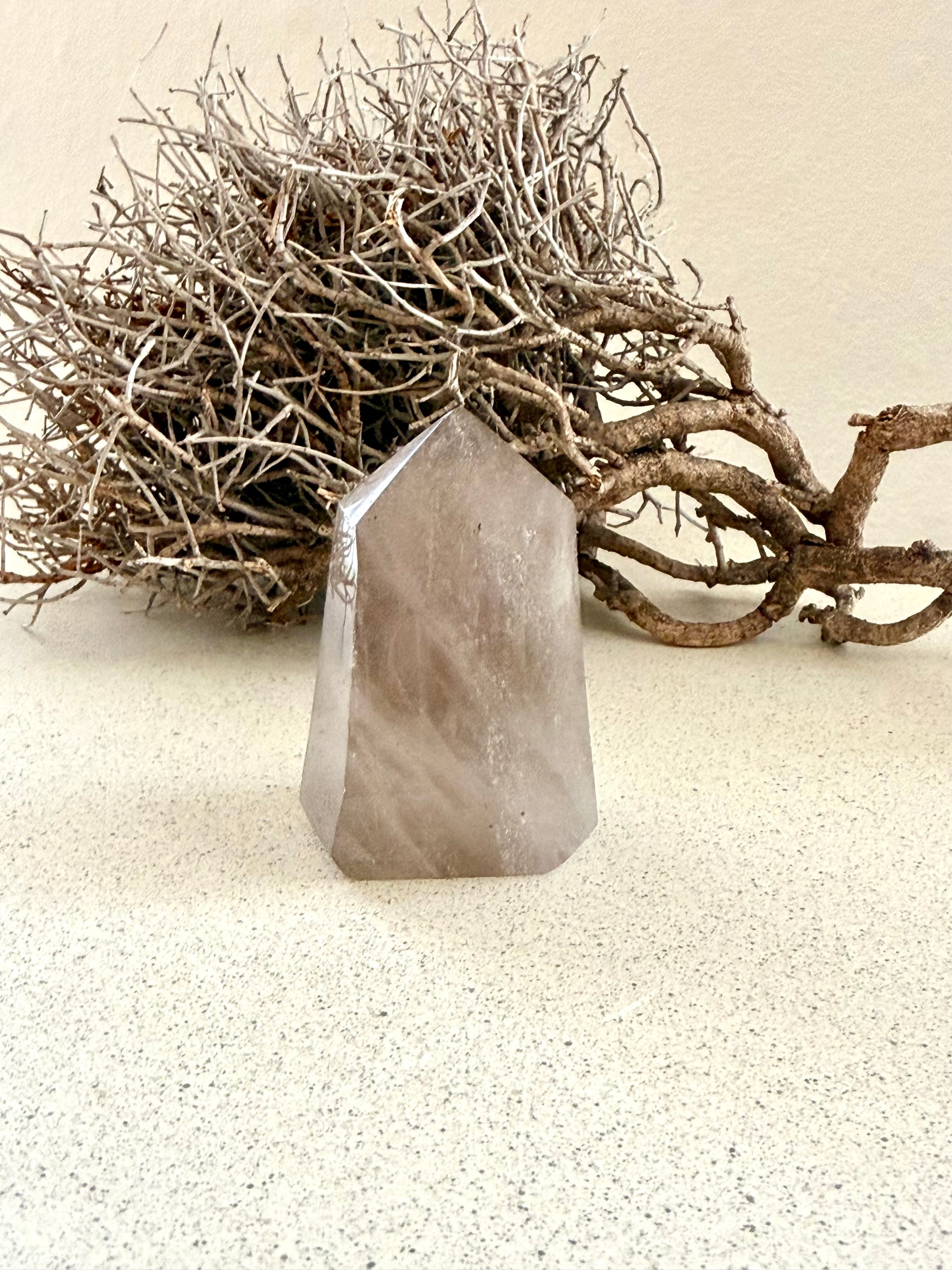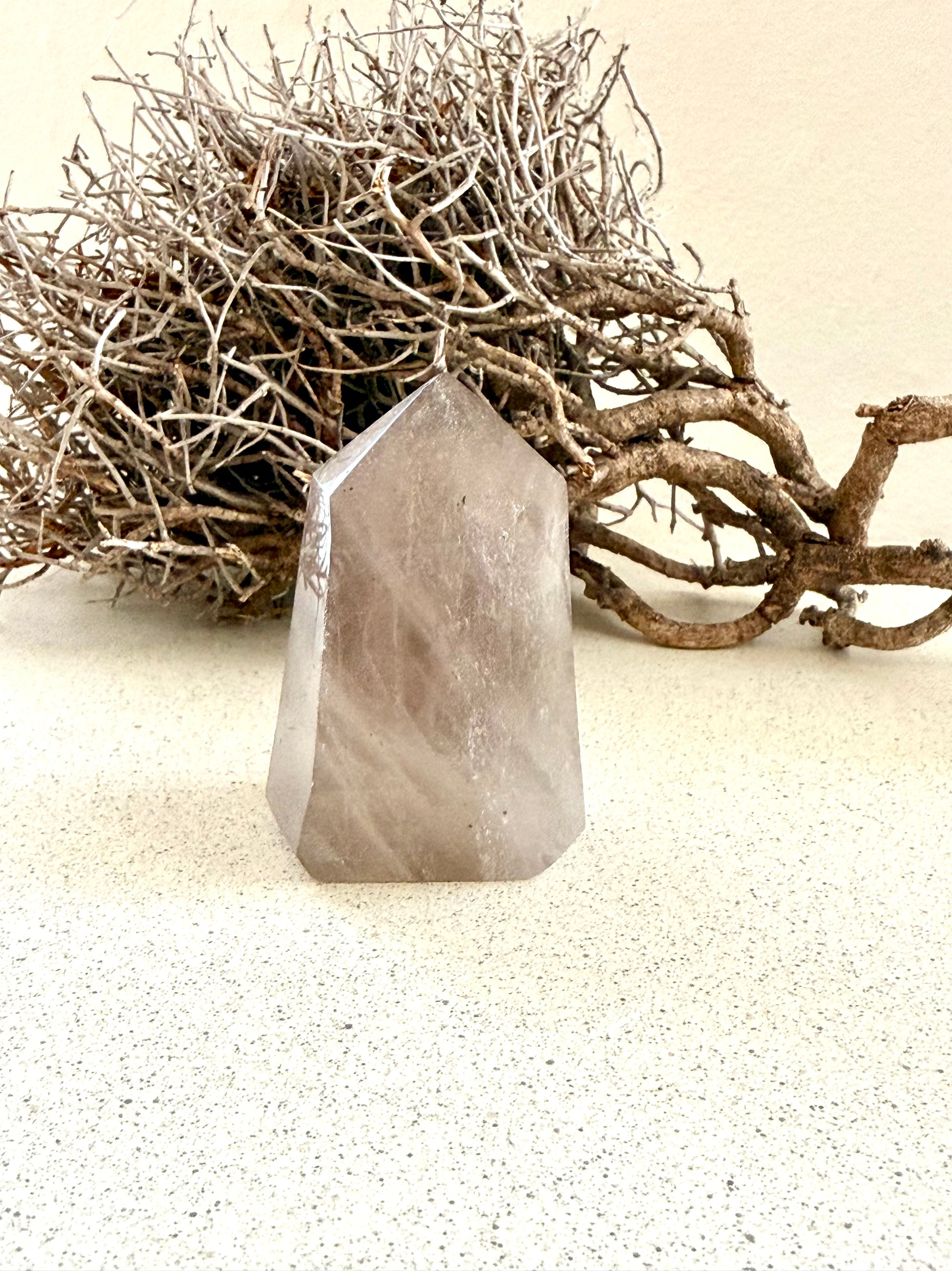 Diese Rauchquarzspitze trägt eine ruhige, klare Tiefe in sich.