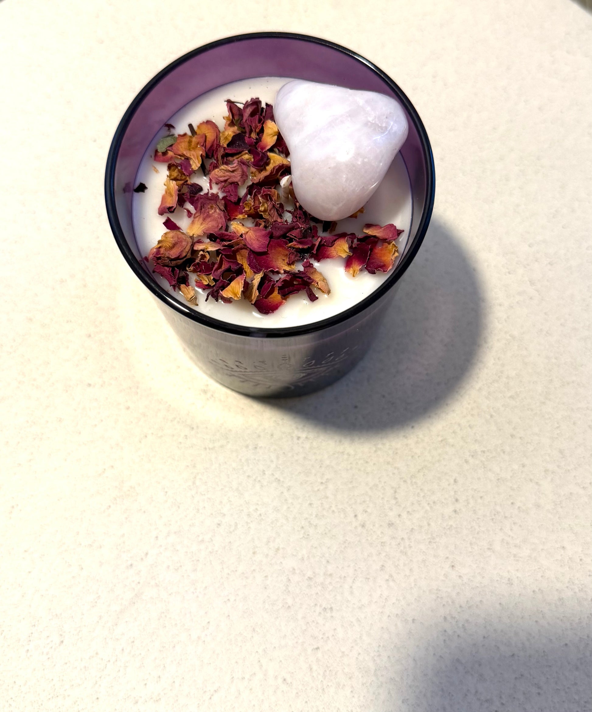 Im violetten Glas, behütet vom schützenden Auge, entfaltet sich eine Kerze, die wie ein sanfter Herzöffner wirkt. Rosenblätter und ein Rosenquarz ruhen in der Oberfläche – ein zarter Hinweis auf Weichheit, Verbindung und die Rückkehr zu deiner eigenen Herzenergie.