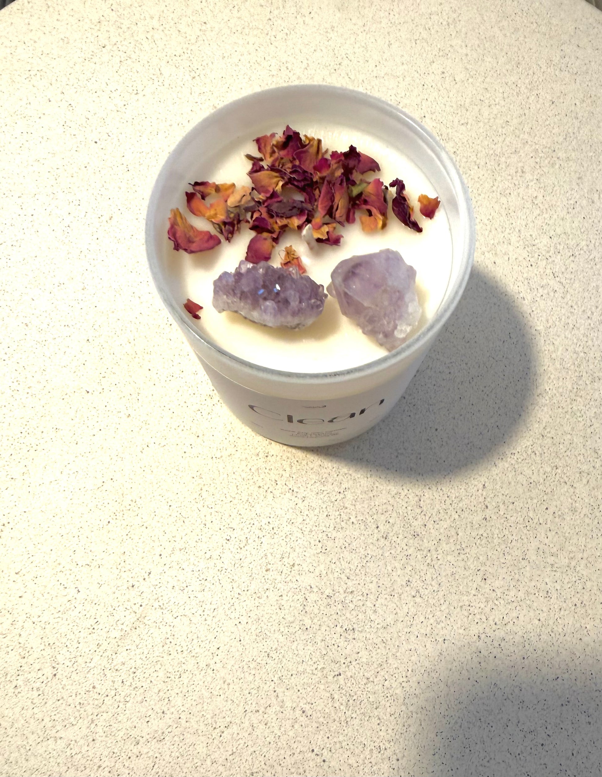 In der Oberfläche liegen Rosenblätter und eine kleine Spirit-Quartz-Amethyst-Spitze. Der Kristall kann nach dem Abbrennen gereinigt und weiterverwendet werden.